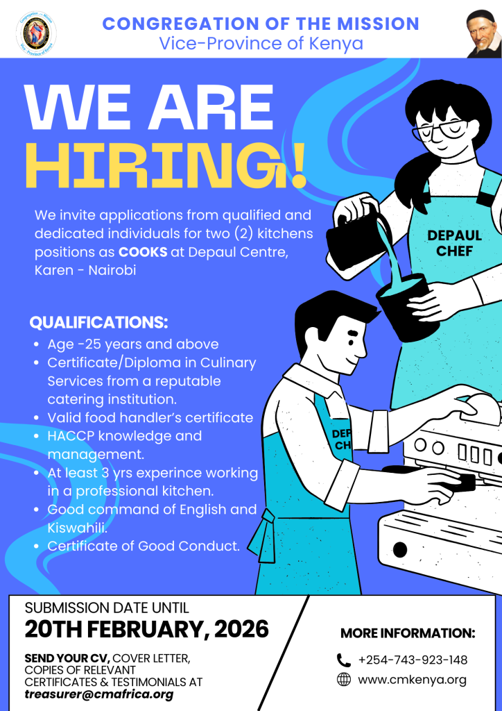 The Congregation of the Mission, a Catholic religious institution that hosts about 60 residents from across the country and beyond and offers accommodation, conference, and banqueting facilities, invites applications from qualified and dedicated individuals for two (2) kitchen positions as Cooks at Depaul Centre, Karen, Nairobi.